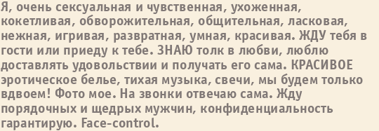 Множество очаровательных проституток и путан ждет Вас в гости. Займитесь сексом с ними и окунитесь в мир безумной любви и страсти, а наш сайт поможет Вам в этом!