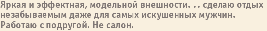 Множество очаровательных проституток и путан ждет Вас в гости. Займитесь сексом с ними и окунитесь в мир безумной любви и страсти, а наш сайт поможет Вам в этом!