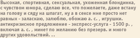 Множество очаровательных проституток и путан ждет Вас в гости. Займитесь сексом с ними и окунитесь в мир безумной любви и страсти, а наш сайт поможет Вам в этом!