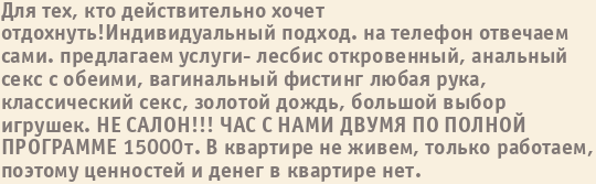 Множество очаровательных проституток и путан ждет Вас в гости. Займитесь сексом с ними и окунитесь в мир безумной любви и страсти, а наш сайт поможет Вам в этом!
