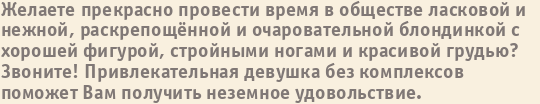 Множество очаровательных проституток и путан ждет Вас в гости. Займитесь сексом с ними и окунитесь в мир безумной любви и страсти, а наш сайт поможет Вам в этом!