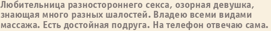 Множество очаровательных проституток и путан ждет Вас в гости. Займитесь сексом с ними и окунитесь в мир безумной любви и страсти, а наш сайт поможет Вам в этом!