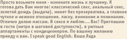 Множество очаровательных проституток и путан ждет Вас в гости. Займитесь сексом с ними и окунитесь в мир безумной любви и страсти, а наш сайт поможет Вам в этом!