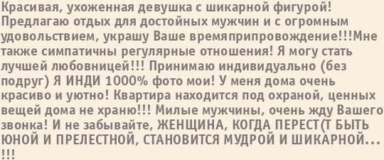 Множество очаровательных проституток и путан ждет Вас в гости. Займитесь сексом с ними и окунитесь в мир безумной любви и страсти, а наш сайт поможет Вам в этом!