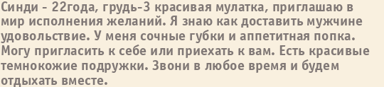 Множество очаровательных проституток и путан ждет Вас в гости. Займитесь сексом с ними и окунитесь в мир безумной любви и страсти, а наш сайт поможет Вам в этом!