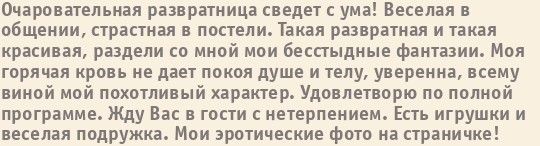 Множество очаровательных проституток и путан ждет Вас в гости. Займитесь сексом с ними и окунитесь в мир безумной любви и страсти, а наш сайт поможет Вам в этом!