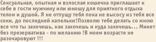 Множество очаровательных проституток и путан ждет Вас в гости. Займитесь сексом с ними и окунитесь в мир безумной любви и страсти, а наш сайт поможет Вам в этом!