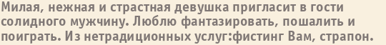 Множество очаровательных проституток и путан ждет Вас в гости. Займитесь сексом с ними и окунитесь в мир безумной любви и страсти, а наш сайт поможет Вам в этом!