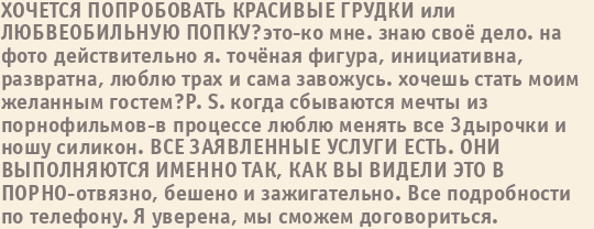 Множество очаровательных проституток и путан ждет Вас в гости. Займитесь сексом с ними и окунитесь в мир безумной любви и страсти, а наш сайт поможет Вам в этом!