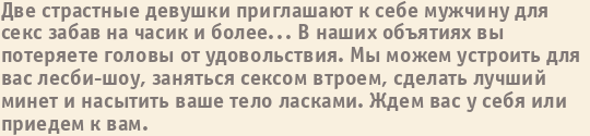 Множество очаровательных проституток и путан ждет Вас в гости. Займитесь сексом с ними и окунитесь в мир безумной любви и страсти, а наш сайт поможет Вам в этом!