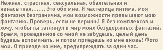 Множество очаровательных проституток и путан ждет Вас в гости. Займитесь сексом с ними и окунитесь в мир безумной любви и страсти, а наш сайт поможет Вам в этом!