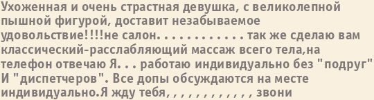 Множество очаровательных проституток и путан ждет Вас в гости. Займитесь сексом с ними и окунитесь в мир безумной любви и страсти, а наш сайт поможет Вам в этом!