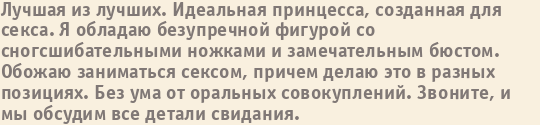 Множество очаровательных проституток и путан ждет Вас в гости. Займитесь сексом с ними и окунитесь в мир безумной любви и страсти, а наш сайт поможет Вам в этом!