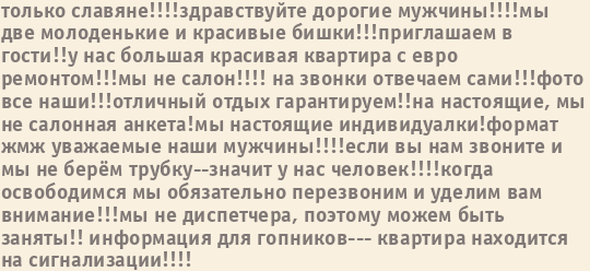 Множество очаровательных проституток и путан ждет Вас в гости. Займитесь сексом с ними и окунитесь в мир безумной любви и страсти, а наш сайт поможет Вам в этом!