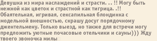 Множество очаровательных проституток и путан ждет Вас в гости. Займитесь сексом с ними и окунитесь в мир безумной любви и страсти, а наш сайт поможет Вам в этом!
