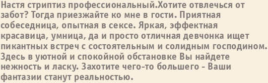 Множество очаровательных проституток и путан ждет Вас в гости. Займитесь сексом с ними и окунитесь в мир безумной любви и страсти, а наш сайт поможет Вам в этом!